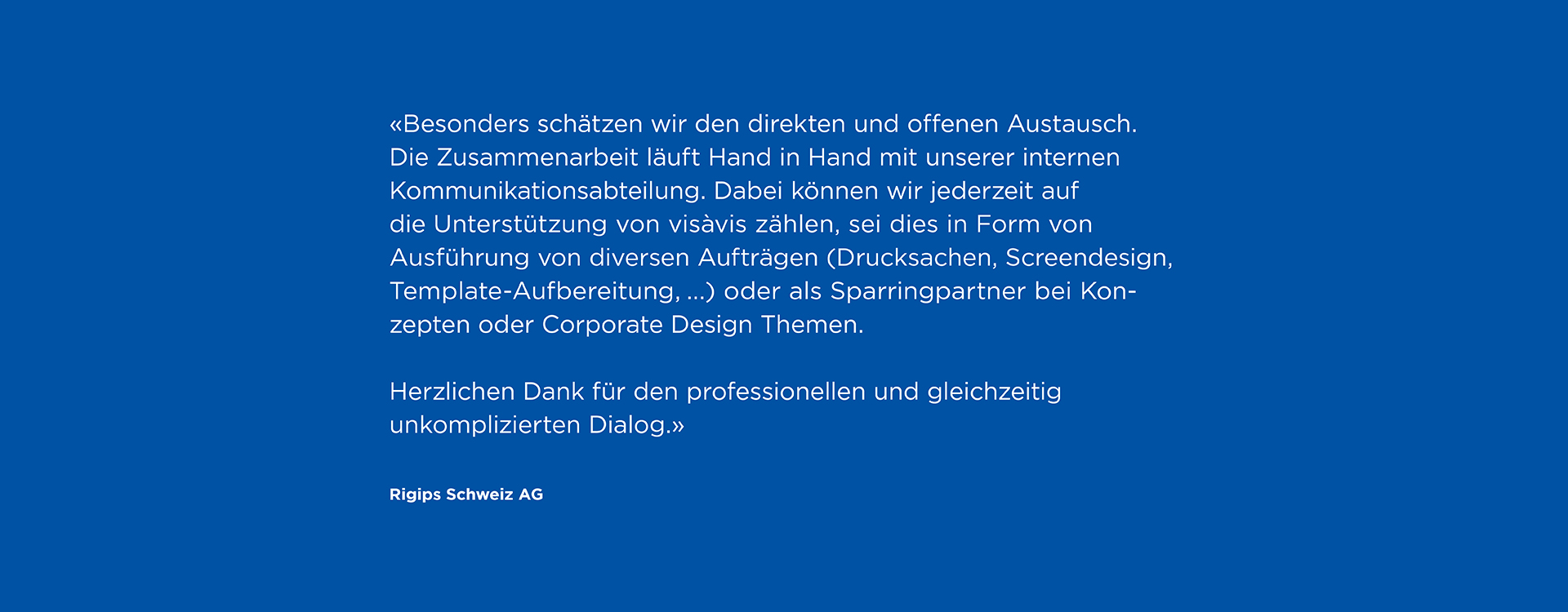 Visàvis erarbeitete auf Basis der CD-Vorlagen für Rigips und seine Subbrands diverse Vorlagen und konkrete Werbemittel wie z.B. Broschüren, Flyer, Online-Banner und Inserate – und nutzte dabei im Rahmen der Vorgaben die gestalterischen Freiheiten.