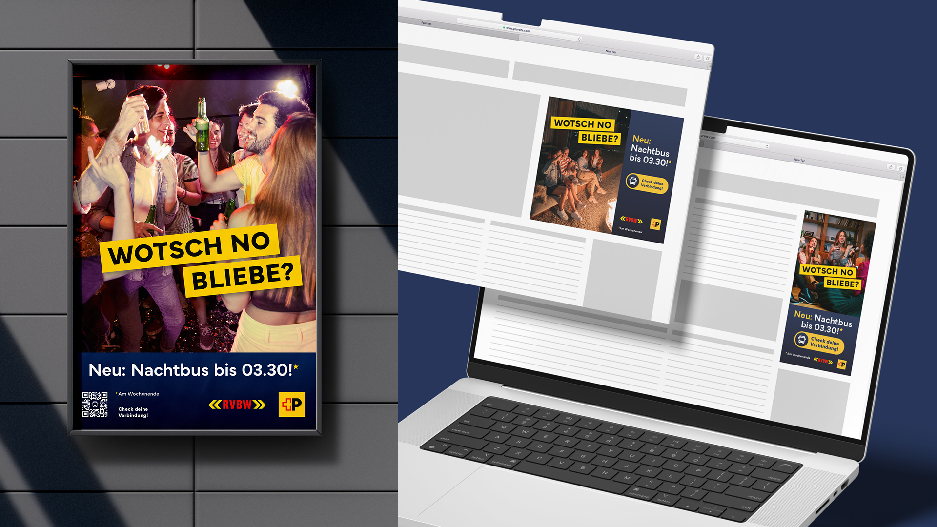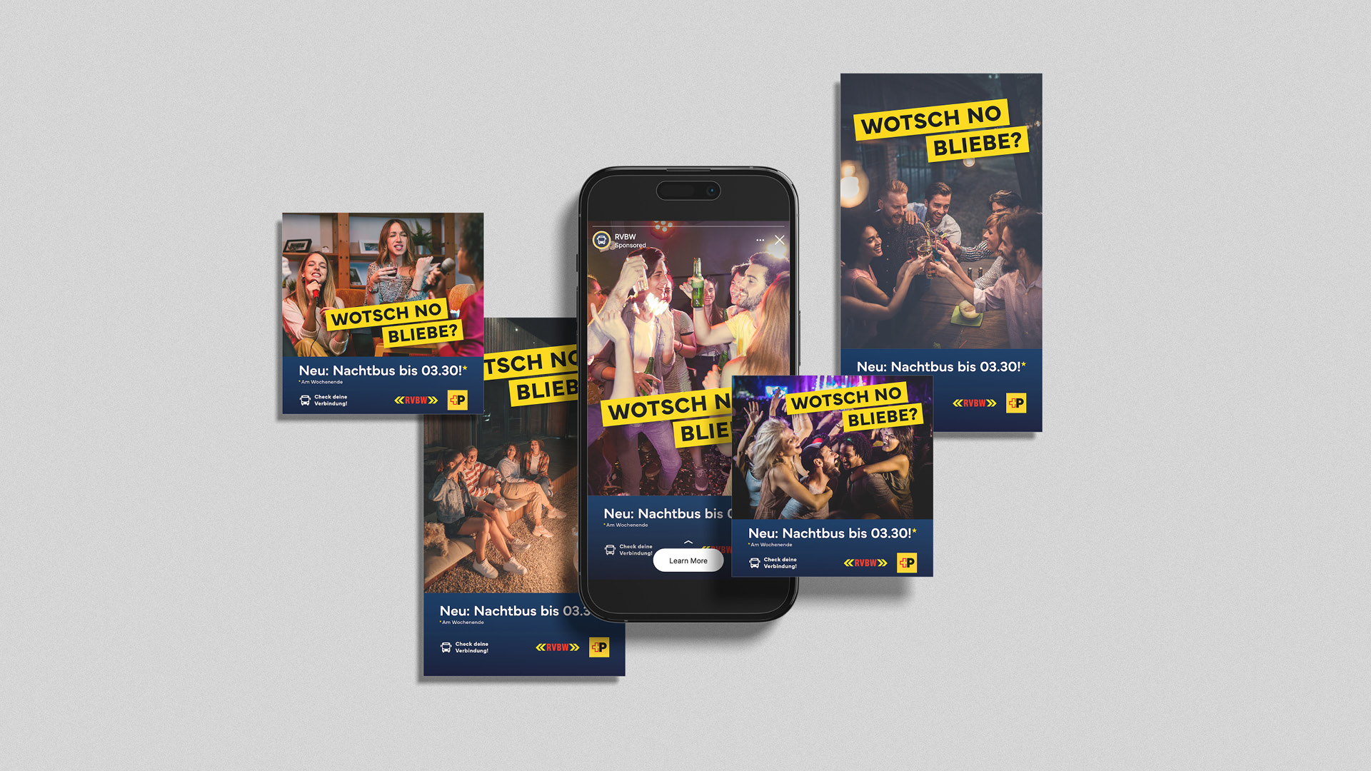 In der Region Baden wurde das Nachtnetz der RVBW und Postauto ausgebaut – neu fahren die Busse am Wochenende bis 03.30 Uhr. Unsere Aufgabe war es, dieses Angebot im Raum Baden bekannt zu machen. Im Zentrum der Kampagne stand das Bedürfnis, den Abend ohne Zeitdruck geniessen zu können – ob an der Party, beim Grillieren oder beim letzten Drink.